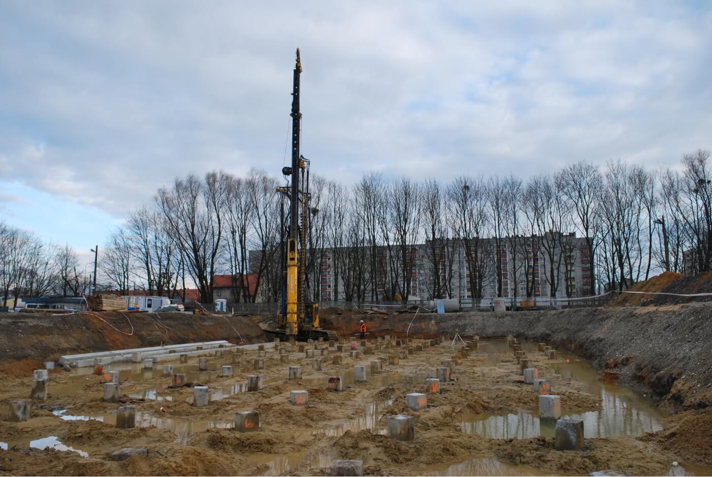 Ze względu na warunki lokalizacyjne (sąsiedztwo istniejących budynków) oraz występujące w podłożu przewarstwienia zagęszczonych gruntów piaszczystych w trakcie robót palowych wykorzystano metodę wspomagania pogrążania pali, polegającą na wstępnym przewiercaniu warstw twardych na głębokość do 10 m świdrem ślimakowym o średnicy 370 mm, co z jednej strony pozwoliło na pogrążenie stóp pali w warstwę nośną, a z drugiej eliminowało oddziaływanie robót palowych na otoczenie przez eliminację drgań, poziomu generowanego hałasu i skrócenie czasu realizacji robót palowych